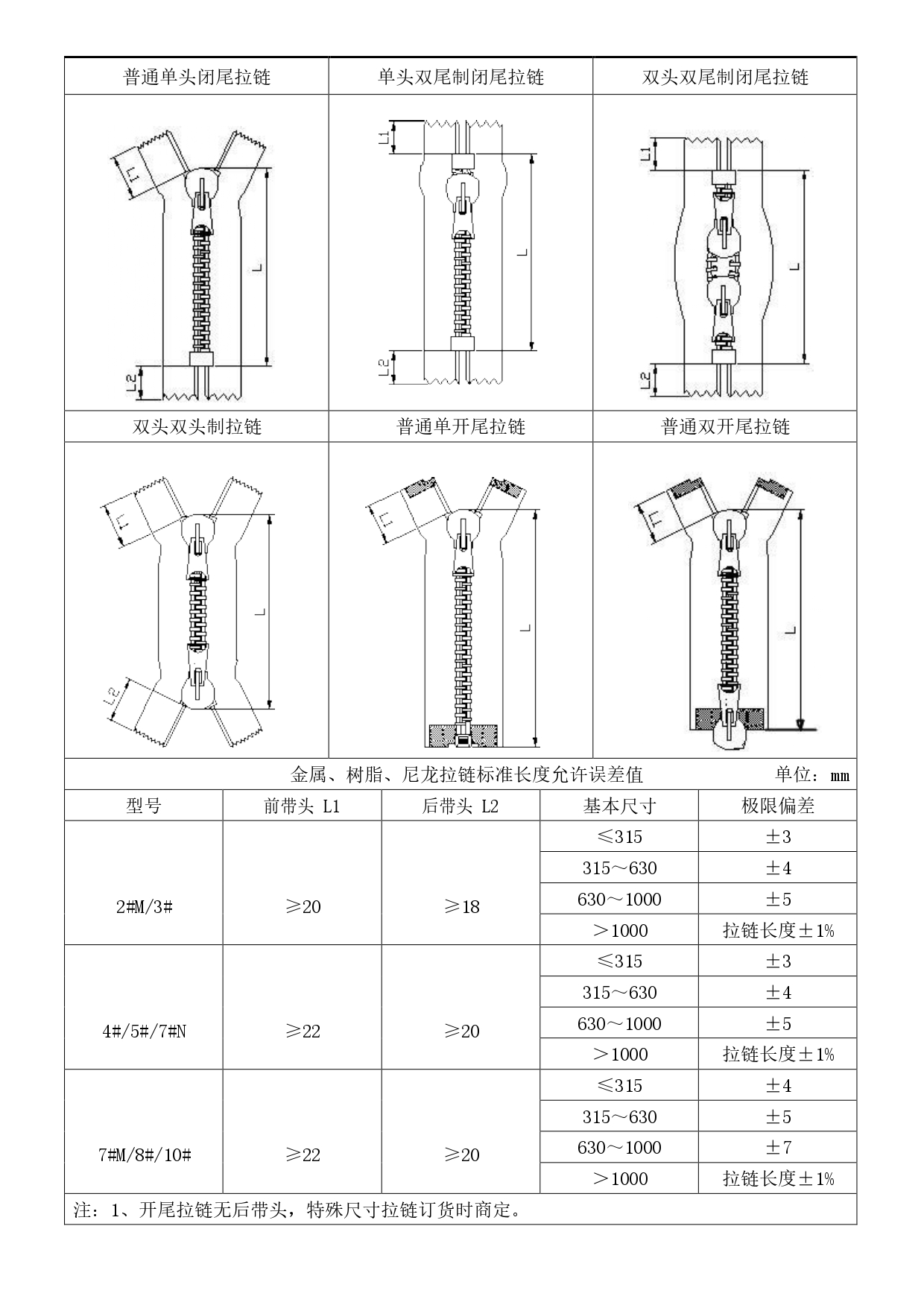 1.1、拉鏈按型式分為條裝拉鏈和碼裝鏈帶:條狀拉鏈可分為開(kāi)尾拉鏈和閉尾拉鏈;開(kāi)尾拉鏈又分為單開(kāi)尾拉鏈和雙開(kāi)尾拉鏈;閉尾拉鏈可分為單頭閉尾拉鏈和雙頭閉尾拉鏈;雙頭閉尾拉鏈可分為: